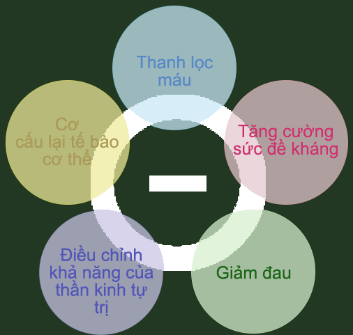 Ion âm làm tăng lượng calcium đã ioin hóa, sản sinh ra chất làm giảm đau cơ thể endorphin và enkephalins và do đó giúp sự hồi phục sự mệt mỏi và nâng cao thể lực, tuần hoàn huyết tốt và giải phóng cơn đau.