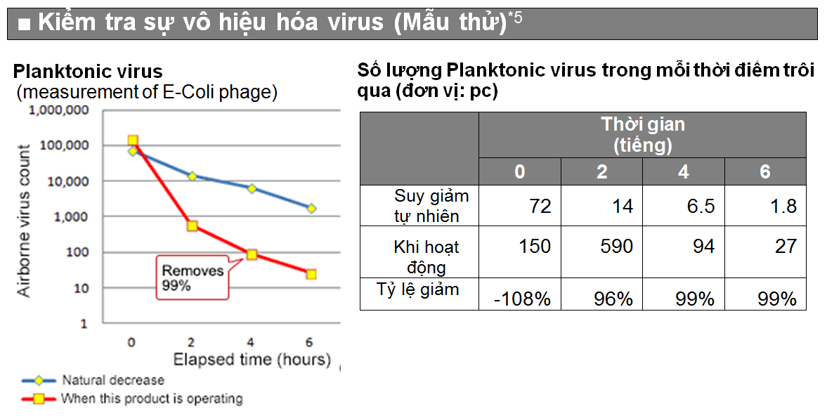 Trong khu vực thử nghiệm niêm phong 25㎥ (khoảng 6 tatami), cài đặt sản phẩm để quạt quay hoạt động và phun dung dịch virus trong mỗi 15 phút, sau khi quay trong 2 phút, thu thập mẫu virus ban đầu nổi lên từ khu vực thử nghiệm (bắt đầu từ 0 phút ). Sau đó, thu thập virus nổi trong mỗi thời gian cụ thể và đo số lượng của virus nổi lên.