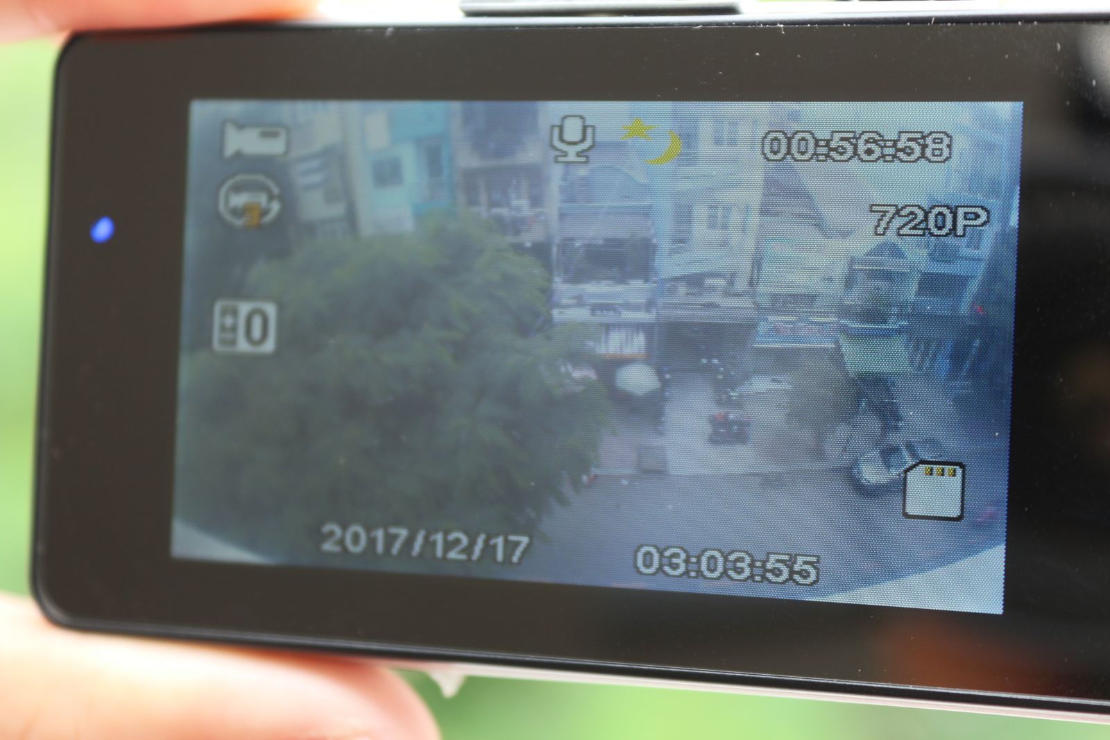 Hình ảnh khá mờ, màu sắc tối. Hiển thị thời gian hoạt động màu trắng ở góc phải |