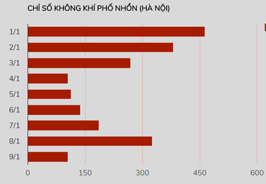 Theo chuỗi số liệu vừa thu thập tại khu vực phố Nhổn (phường Minh Khai, quận Bắc Từ Liêm) từ ngày 1 đến 9/1 thì ba ngày (1,2 và 8/1) chỉ số không khí ở mức nguy hại, trong đó ngày 1/1 AQI vượt 460. Ba ngày ở mức kém (4,5,6/1) và một ngày xấu (3/1).