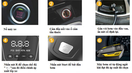 • Tích hợp sẵn các vòi bơm đa năng, có thể bơm lốp xe hơi, xe máy, xe đạp, banh, lều, phao, và các vật dụng cao su.