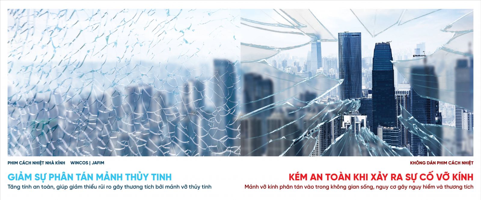 Giảm sự phân tán các mảnh thủy tinh khi xảy ra sự cố: Phim cách nhiệt nhà kính sẽ đóng vai trò như một lớp bảo vệ cho không gian bên trong khi xảy ra sự cố vỡ kính. Phim cách nhiệt sẽ giữ lại hầu hết các mảnh vỡ kính, ngăn cho mảnh vỡ văng vào không gian bên trong và giảm thiểu các rủi ro gây thương tích.