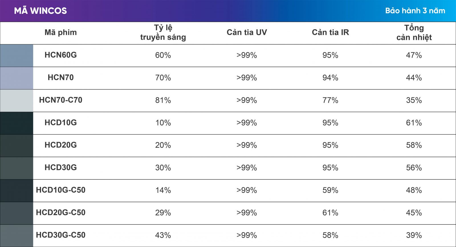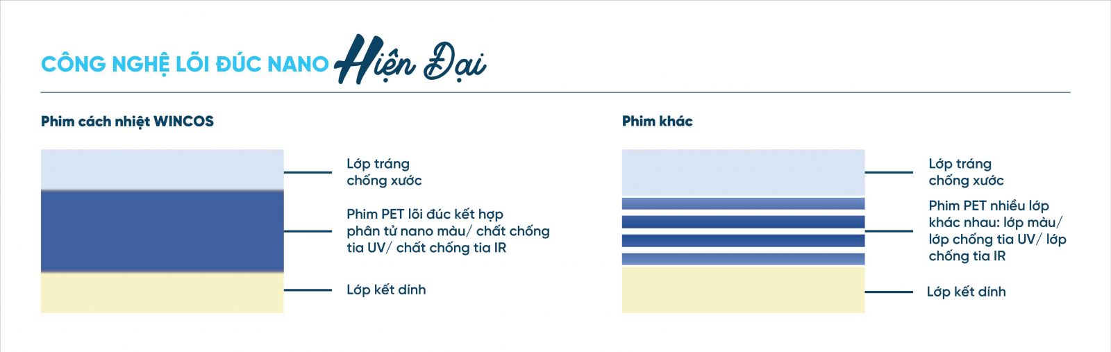 Phim cách nhiệt WINCOS: Phim cách nhiệt WINCOS được sản xuất 100% tại Nhật Bản, áp dụng Công nghệ lõi đúc NANO hiện đại nhất Nhật Bản. Nguyên liệu phim và hợp chất màu - kháng UV được hòa trộn tạo nên lõi đúc PET. Được đồng nhất về màu sắc và độ phân tán tạo nên sản phẩm có chiều sâu về chất lượng và độ bền màu lên đến 10 năm.