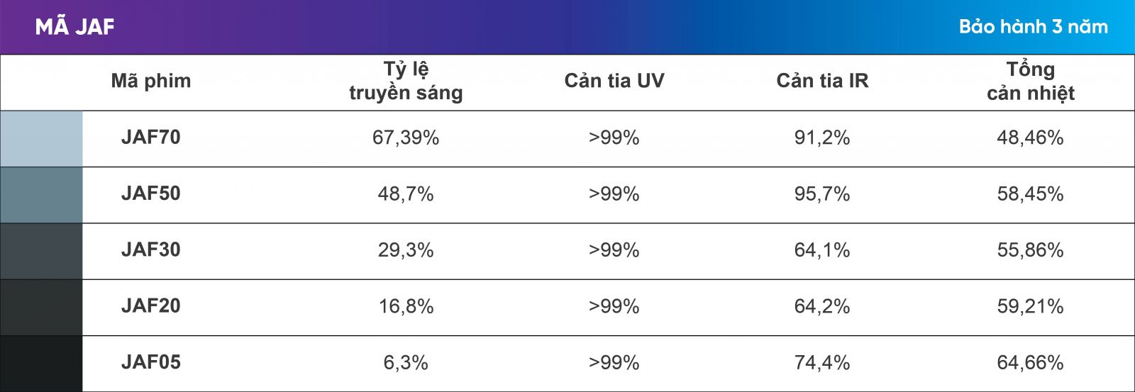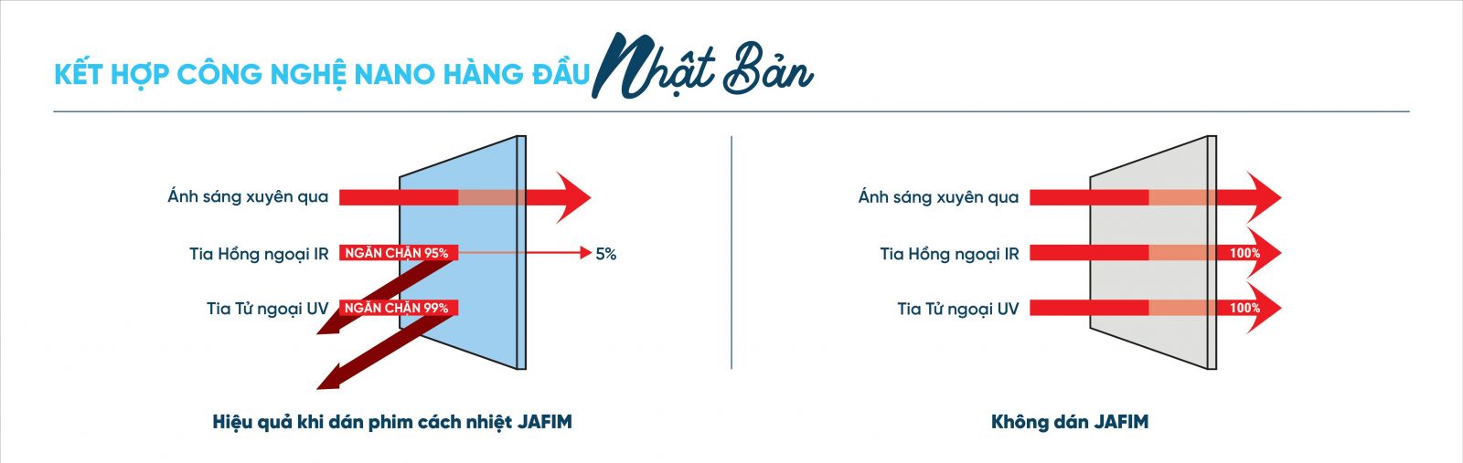 Phim cách nhiệt JAFIM: Phim cách nhiệt JAFIM được sản xuất 100% tại Hàn Quốc với các quy chuẩn khắt khe về chất lượng, đồng thời được kết hợp sản xuất với Công nghệ NANO Hồng ngoại hiện đại tạo nên sản phẩm phim cách nhiệt có công suất vượt trội.
