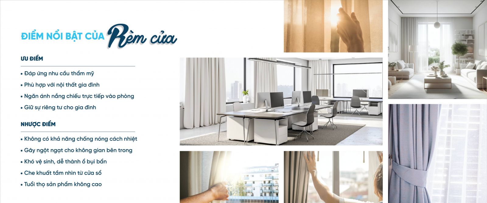 Ưu điểm chính của rèm cửa là đa dạng kiểu dáng, màu sắc và họa tiết giúp đáp ứng nhu cầu thẩm mỹ cho gia chủ. Đồng thời ngăn ánh nắng chiếu trực tiếp vào không gian nội thất bên trong. Tuy rèm cửa có thể ngăn chặn ánh nắng chiếu trực tiếp vào không gian nhà ở bên trong nhưng lại không có khả năng cách nhiệt, chống nóng cho không gian nhà ở bên trong. Rèm cửa tuy có thể đáp ứng nhu cầu về thẩm mỹ nội thất cho ngôi nhà nhưng lại hạn chế tầm nhìn từ cửa sổ ra bên ngoài. Rèm cửa càng dày đồng nghĩa với không gian bên trong càng tối và ngột ngạt. Độ bền của các sản phẩm rèm cửa không cao do phải thường xuyên tiếp xúc trực tiếp với ánh nắng Mặt trời. Để giữ cho không gian bên trong nhà luôn sạch sẽ và tránh gây mùi khó chịu thì gia chủ cần thường xuyên vệ sinh rèm cửa, bởi rèm cửa nếu không được vệ sinh thường xuyên và đúng cách sẽ tạo nên ổ vi khuẩn, bụi bẩn và gây mùi hôi khó chịu. Tuy nhiên việc vệ sinh này cũng sẽ mất rất nhiều thời gian và chi phí nếu đem ra tiệm giặt ủi hoặc sử dụng cách dịch vụ vệ sinh.