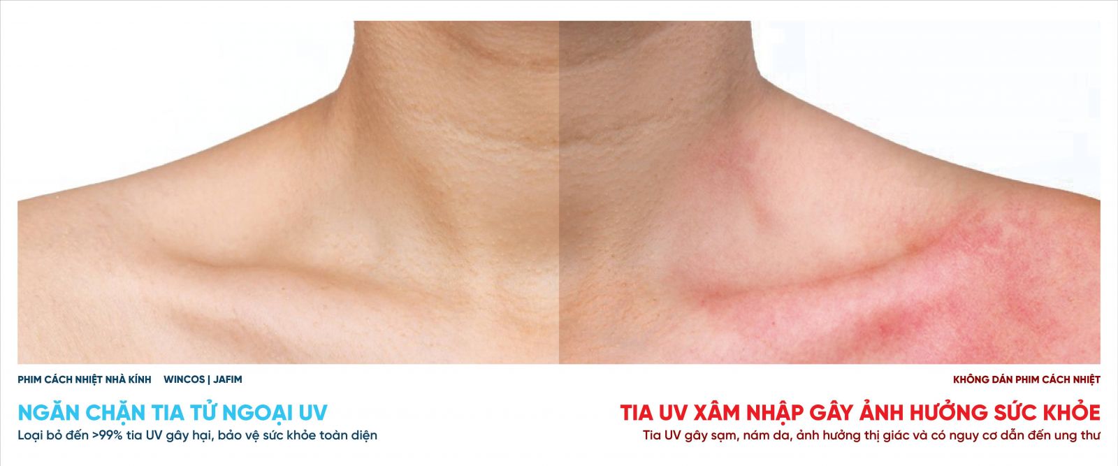 Ngăn cản tia Tử ngoại UV: Tia UV là tia gây ảnh hưởng trực tiếp đến sức khỏe con người. Tia UV gây sạm, nám da, ảnh hưởng đến mắt và có nguy cơ dẫn đến ung thư. Đồng thời tia UV khi tiếp xúc với nội thất sẽ làm nội thất bị bạc màu và giảm tuổi thọ sử dụng. Các dòng phim cách nhiệt chất lượng sẽ loại bỏ gần như 100% tia UV gây hại này để bảo vệ toàn diện cho không gian nhà ở bên trong.
